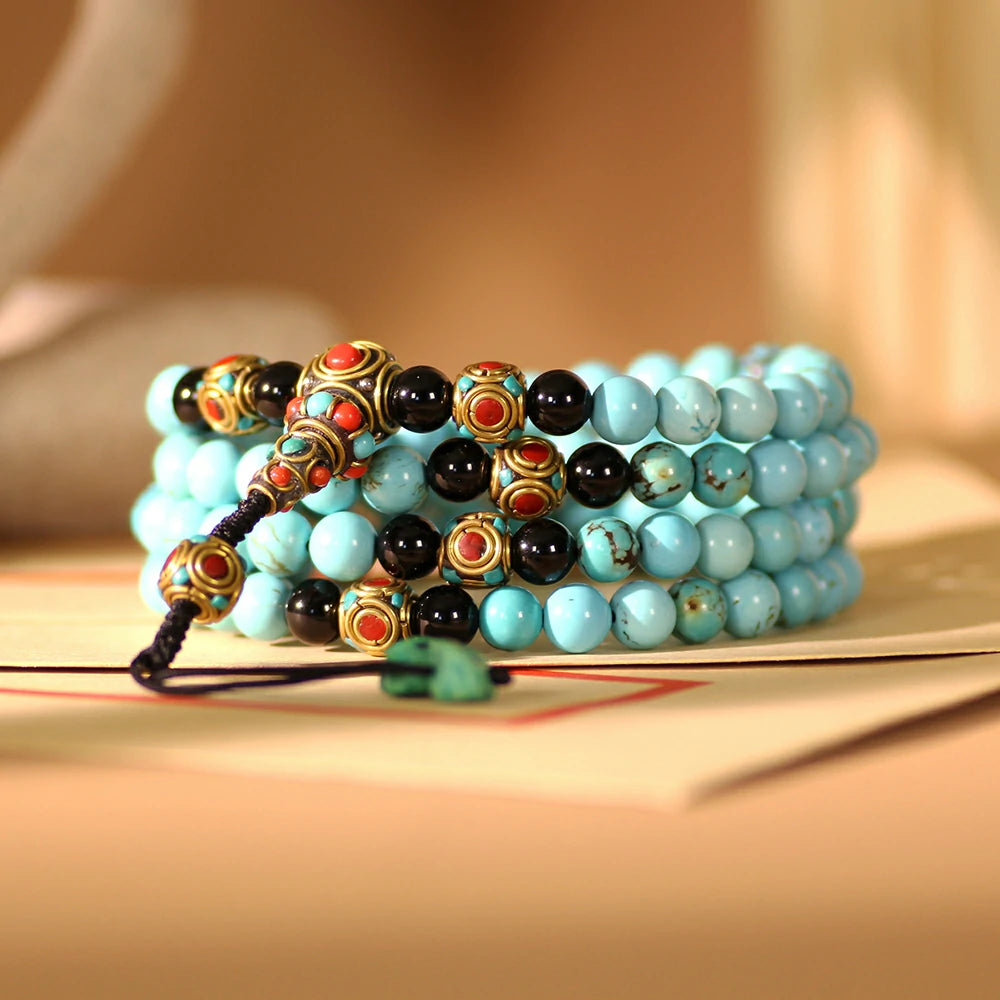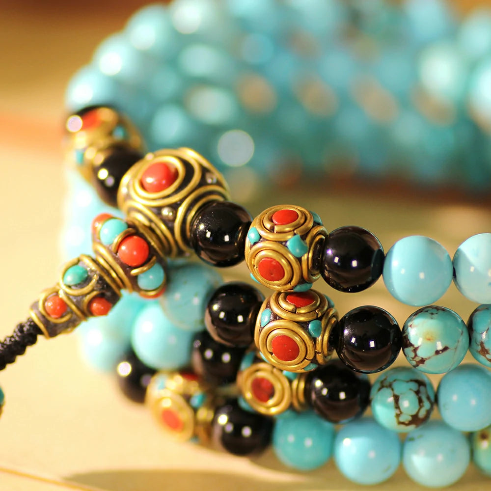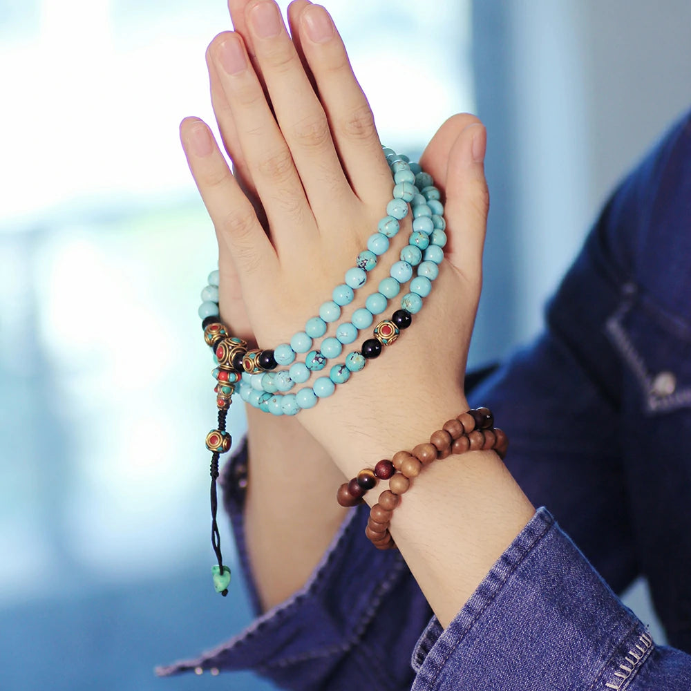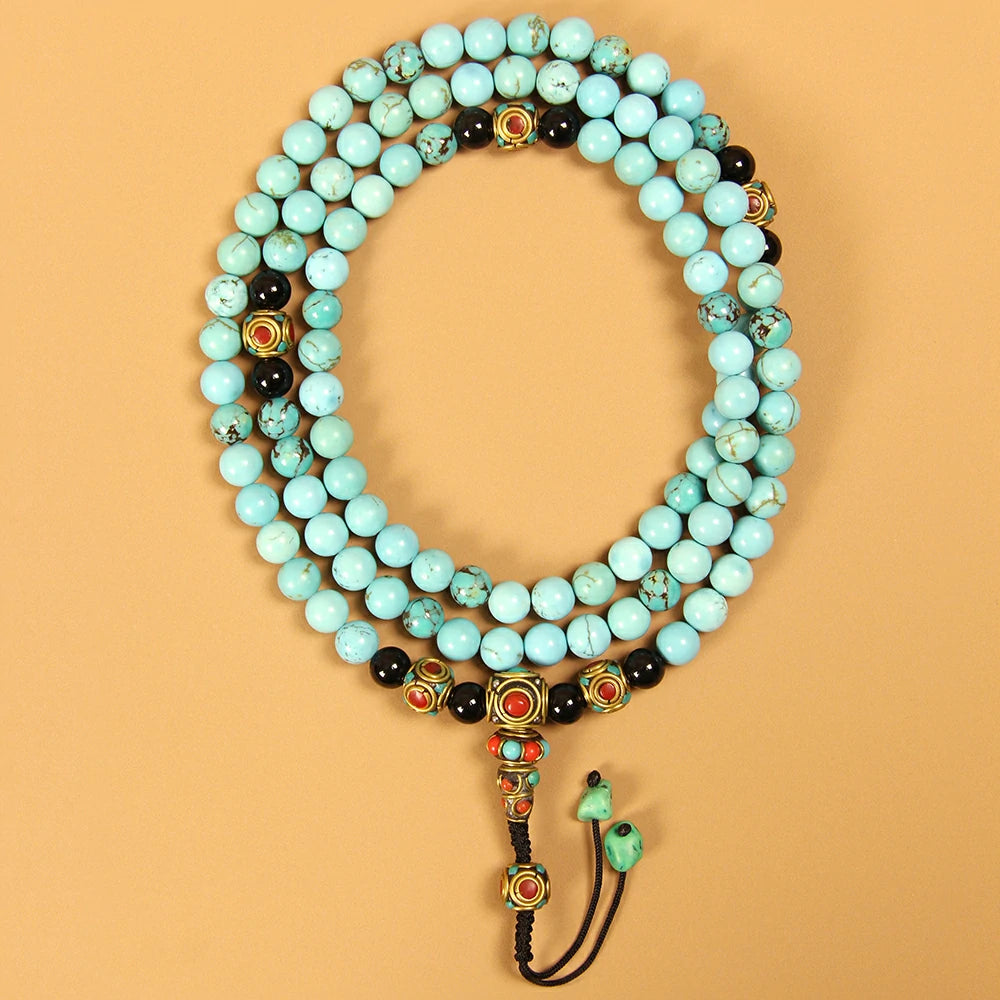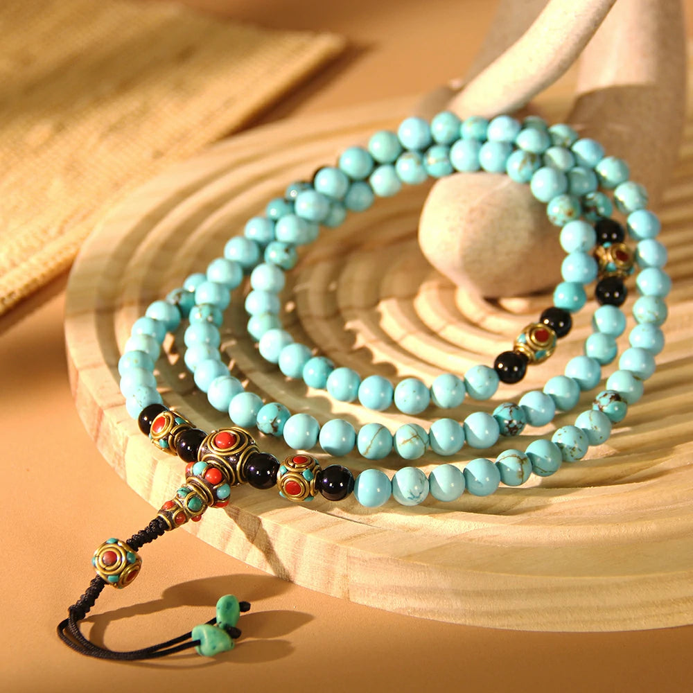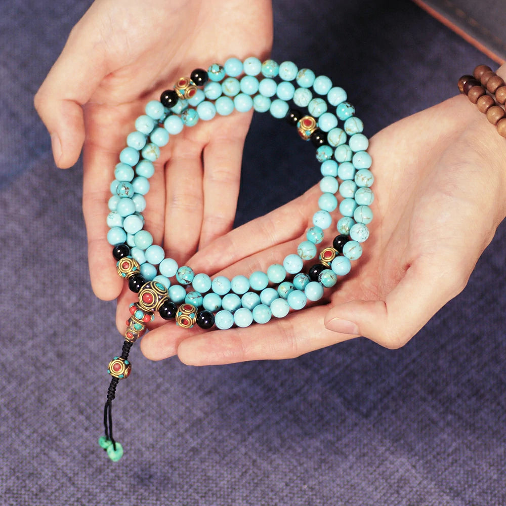Crafted from natural turquoise stones meticulously polished, each bead boasts pure hues and unique veining, imbued with the energy of nature. Revered as the "sky stone," turquoise symbolizes serenity, wisdom, and divine protection, making it an ideal choice for meditation practice, prayer rituals, and mantra recitation. Holding these prayer beads, you can feel the soothing texture of natural mineral, helping to calm the mind, enhance concentration, and embark on a spiritual journey.