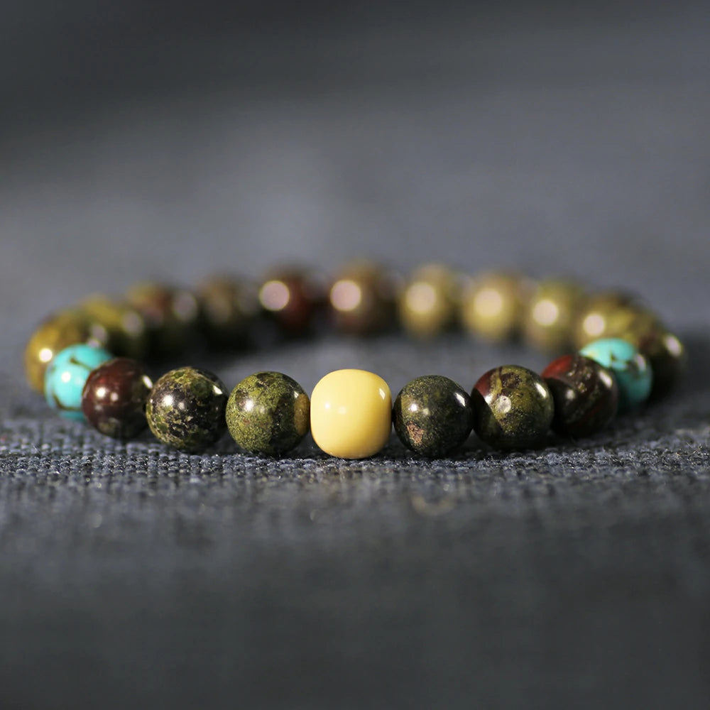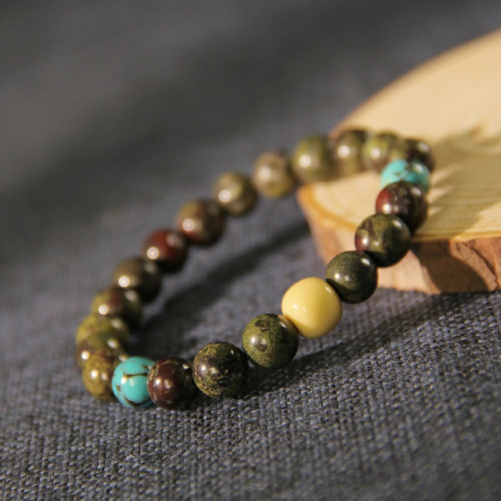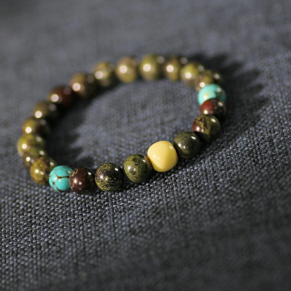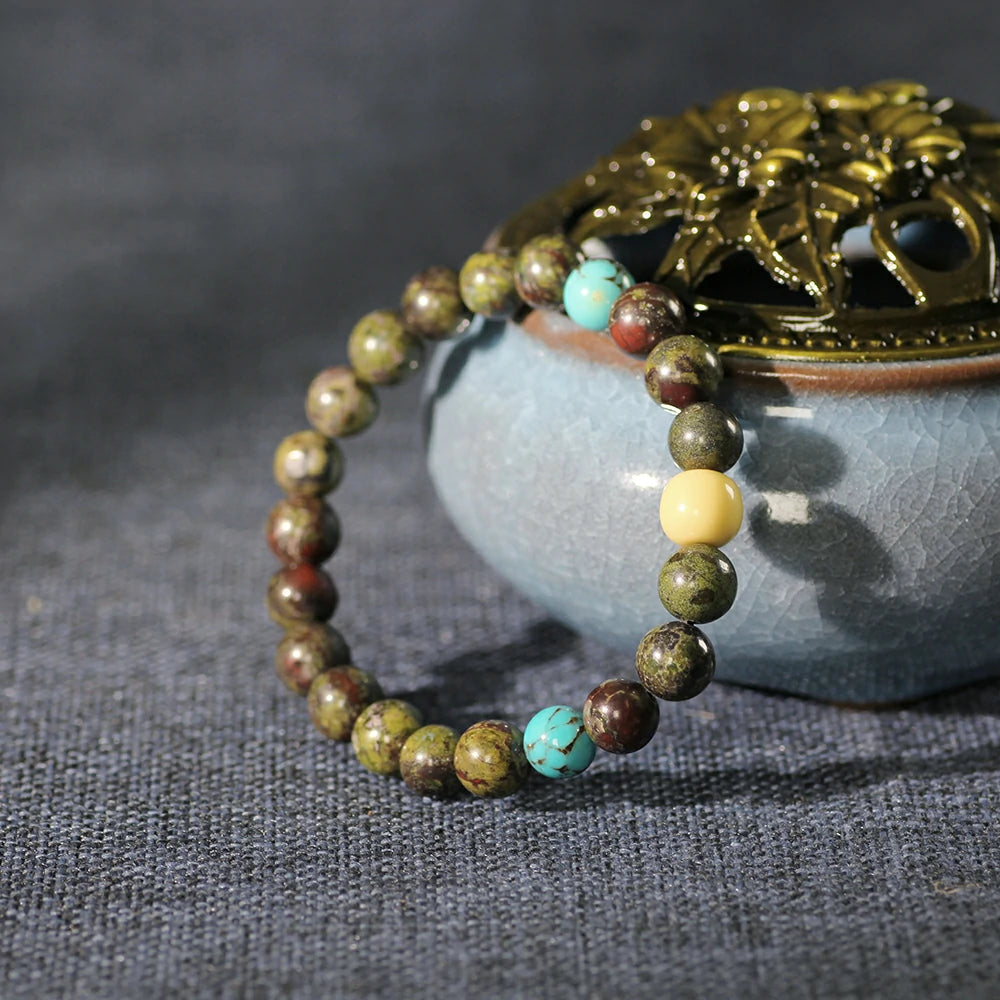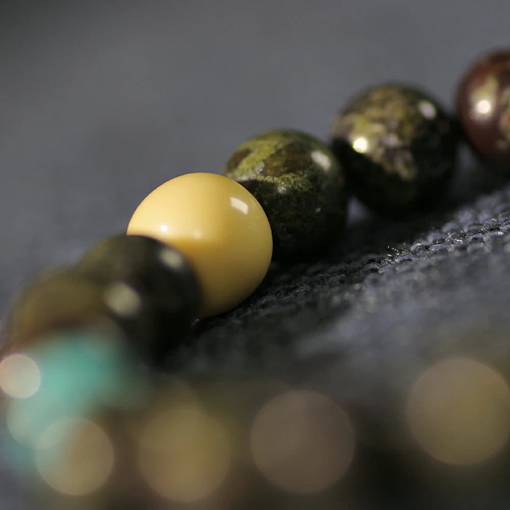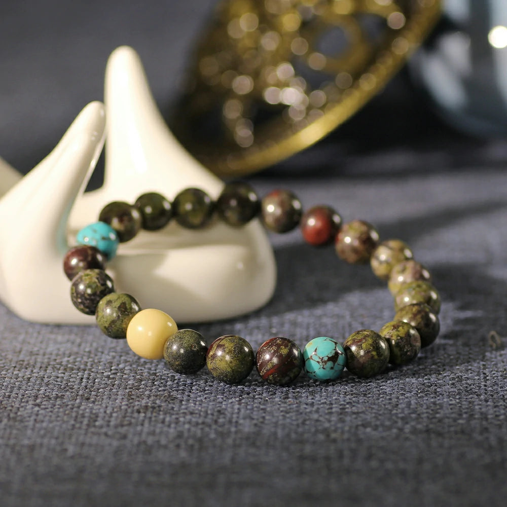 The Mystic Dragon Bloodstone Bracelet is meticulously crafted from deep turquoise and pristine snow-white glazed glass, perfectly blending ancient energy aesthetics with modern fashion. Each bead is hand-polished, showcasing unique textures and luster, making it both a powerful energy talisman and an exquisite statement piece for personal style.