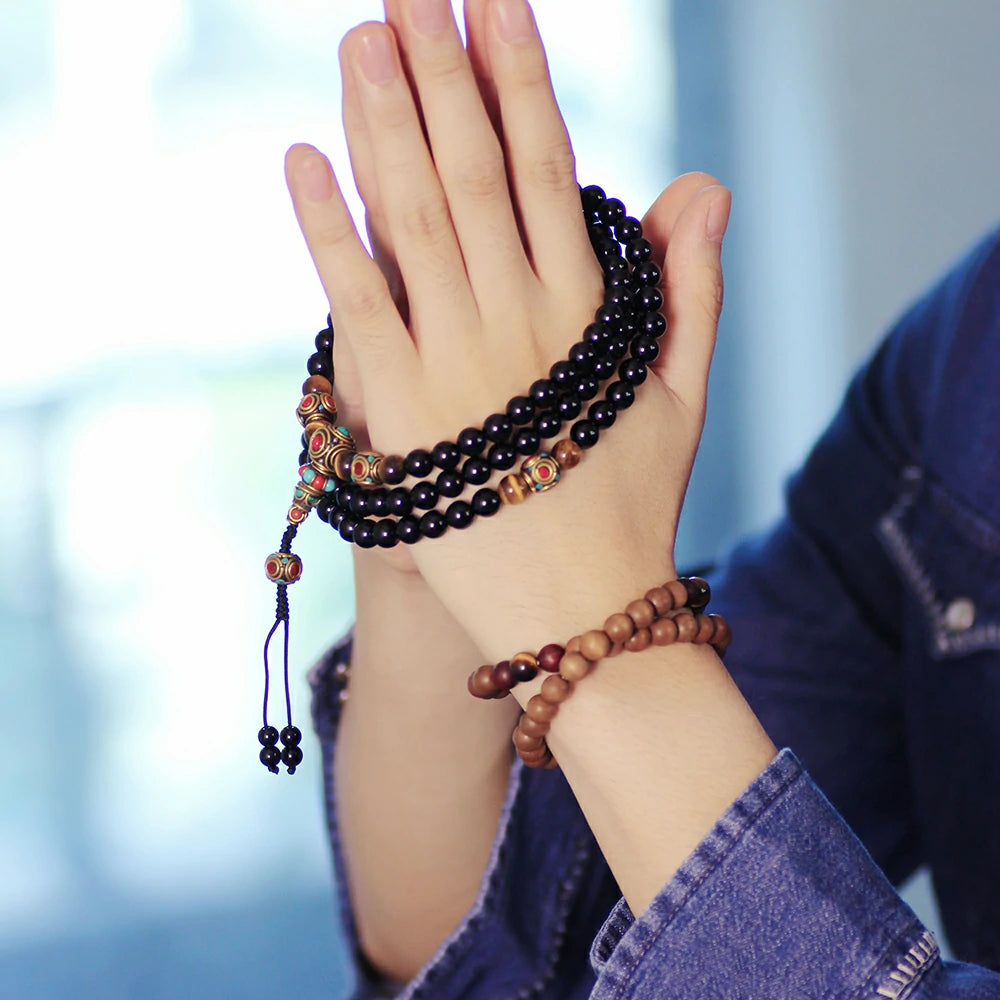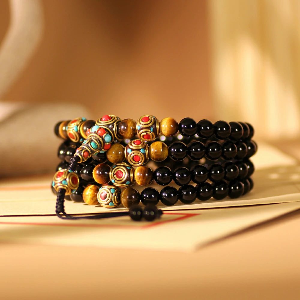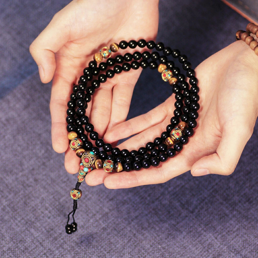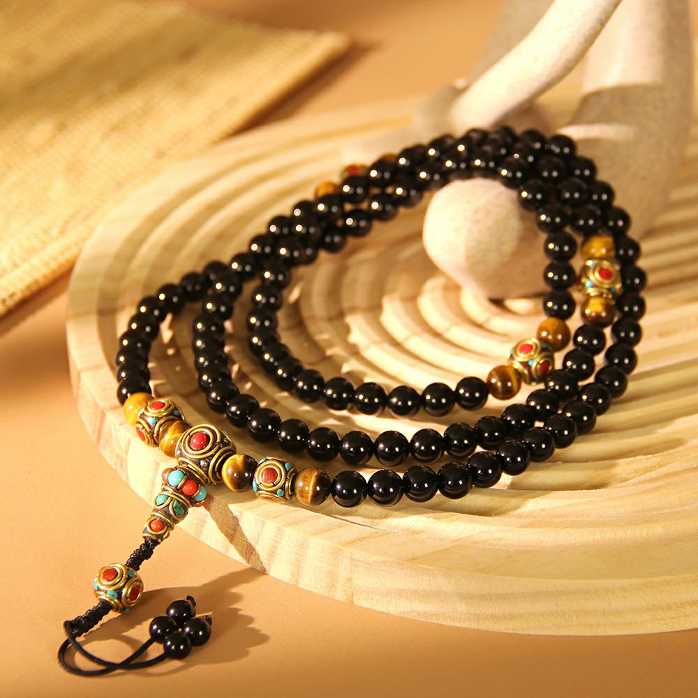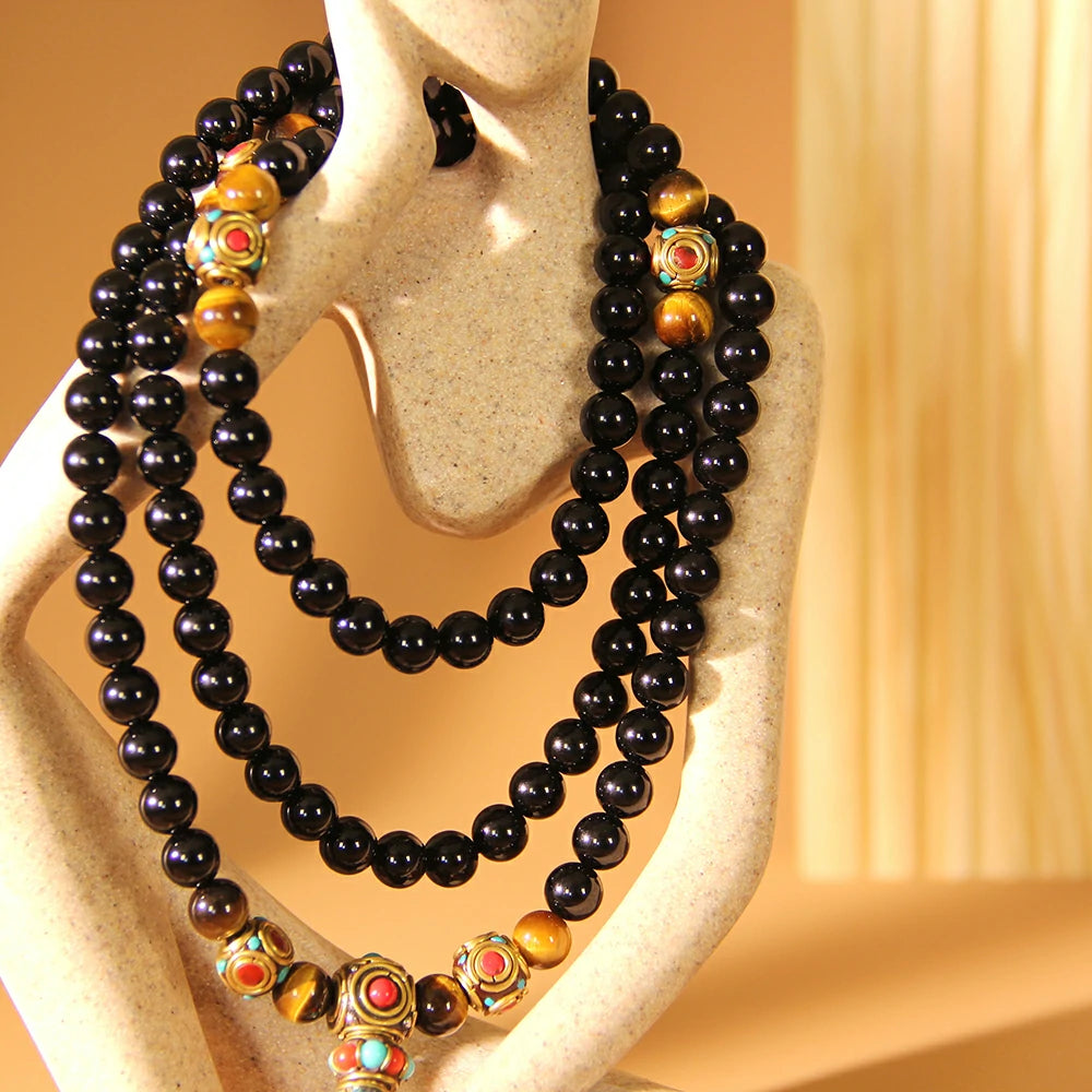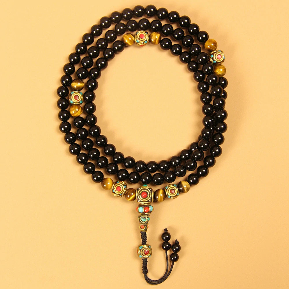 Crafted from natural obsidian, each bead is meticulously polished to a smooth, rounded perfection, gleaming with the profound depth of the night sky while embodying the earth's primal energy. Revered since ancient times as a "sacred stone of protection and evil-warding," this piece combines traditional prayer bead craftsmanship. It serves not only as a spiritual tool for meditation and scripture recitation but also as an elegant energy-charged accessory for daily wear, helping to harmonize body and mind while shielding against negative influences.